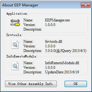 在About EEP Manager的對話窗中,可以看到EEPManager、Srvtools和InfoRemoteModule的各版本號碼。