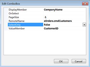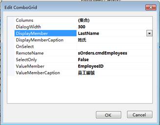 然後,分別設定DisplayMember和ValueMember的欄位。在這個屬性編輯器中,我們會發現有幾個和combo不同的屬性,他們分別是DisplayMemberCaption和ValueMemberCaption以及Columns。由於ComboGrid需要將顯示的欄位以Grid的形式展現,因此Columns用於設定Grid上的欄位。當然這個屬性也可以不設定,在不設定的情況下,系統自動會根據DisplayMember和ValueMember設定的欄位來顯示在grid上,同時根據DisplayMemberCaption和ValueMemberCaption顯示在Grid的Caption上。