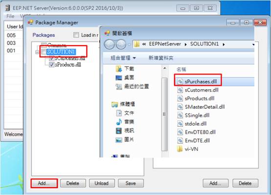 [Package Manager] 選取專案掛載sPurchases.DLL。