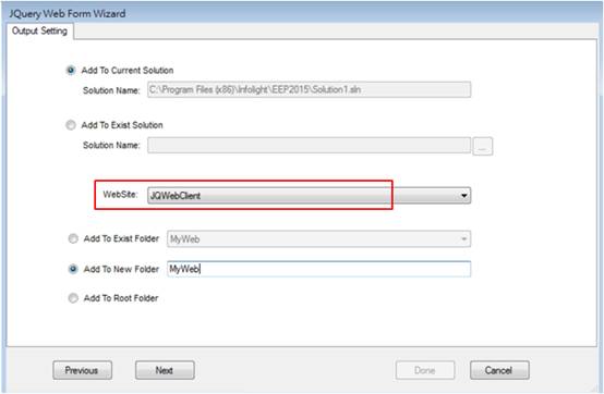 // 選擇儲存網頁的網站,請注意選擇JQWebClient,設定Folder。