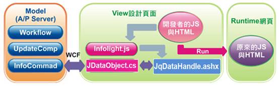JQDataHandle.ashx:為Infolight.js與JDataObject間的接口,開發者在開發網頁時是以JQuery來呼叫Infolight.js,然後Infolight.js再透過JDataHandle.ashx來執行JDataObject的方法。