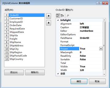 在Grid中每個欄位可以實現Frozen(凍結)以及Sortable(排序)的功能,這些功能同樣在Grid的Columns的屬性中對每個欄位進行一一設定。首先我們將OrderID、CustomerID以及EmployeeID這三個欄位的Frozen屬性設定為true,這樣grid的這三個欄位就會被凍結。