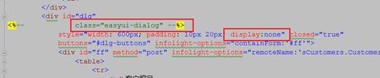 將前面設計的dialog顯示的div,將它的class=”easyui-dialog”註釋起來,同時將它的style加入display設定為none。