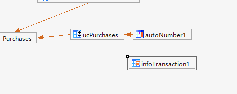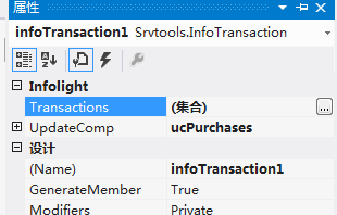 Step1> Detail的過帳與Master的設定基本相同。打開sPurchases項目,增加一個infoTransaction元件,命名為【tsDetail】。先設定『UpdateComp』屬性,這裡選擇【ucPurchaseDetails】。