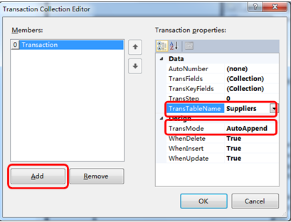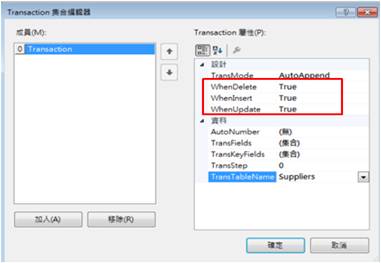 接著設定『TransMode』屬性,此用來處理過帳之前是否先瞭解對方是否有相對資料。這裡設為【AutoAppend】。代表Suppliers不存在時,會自動新增一筆相對的資料到Suppliers中。上面的模式中,只有AlwaysAppend在過帳前不會去Select對方Table的相對資料是否存在,其餘都會去Select,而且也是必要的。