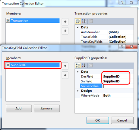 Step4> 點擊TransKeyFields屬性右邊的【…】按鈕,出現TransKeyField Collection Editor視窗。按左下的【Add】按鈕,增加一個TransKeyField,下拉選擇 『SrcField』 屬性為【SupplierID】,『DesField』屬性也選【SupplierID】。(兩個Table的欄位名稱剛好相同)。