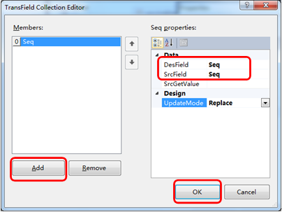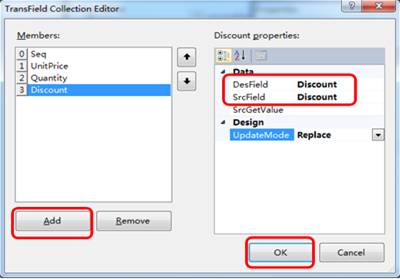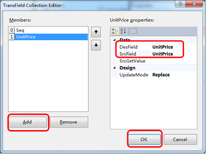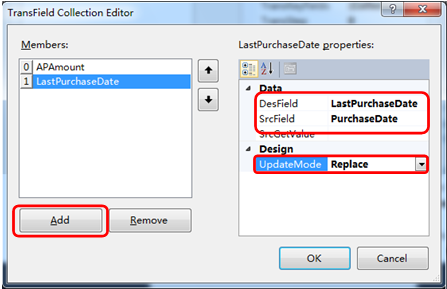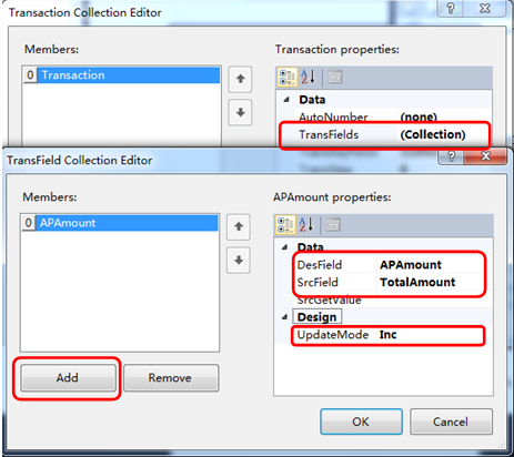 Step5> 點擊TransFields屬性右邊的【…】按鈕,出現TransField Collection Editor視窗,點擊左下的【Add】按鈕,增加一個TransField,下拉選擇『DesField』為【ApAmount】,『SrcField』選擇為【TotalAmount】,『UpdateMode』選擇為【inc】。