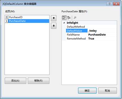 Step8> 在先前的JQDefault的Columns屬性按下【…】設定增加一個欄位。『FieldName』選【PurchaseDate】,『DefaultValue』設定為一個系統變數【_today】。