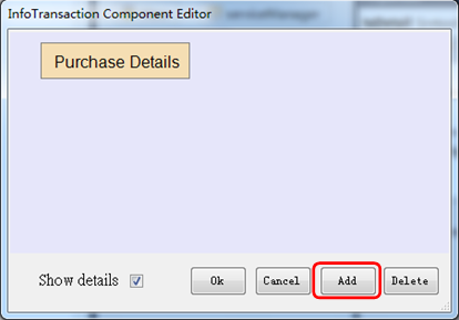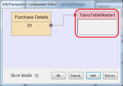 Step2> 連點兩下(double click)tsDetail就會出現如下的InfoTransaction Component Editor設定介面。按下【Add】按鈕,在新增的TransTableName1的方格中連點兩下(double click)。