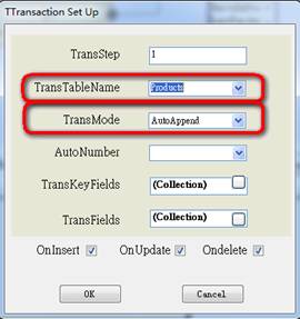 Step3> 在出現的設定介面中,下拉『TransTableName』屬性為【Products】。『TransMode』屬性同樣設為【AutoAppend】(代表如果對方不在會自動新增相對的資料)。