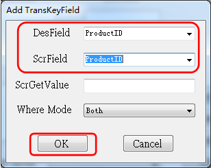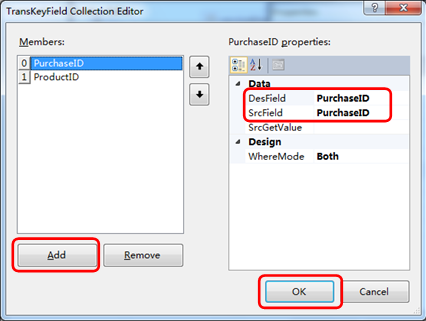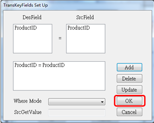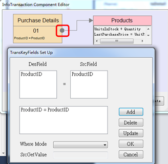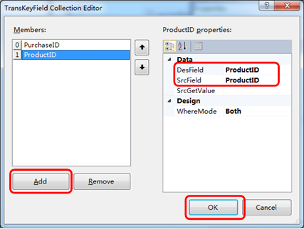 Step4> 按下TransKeyFields屬性右邊的小按鈕【…】,出現新的設定視窗。開始對此Transaction來定義彼此的鍵值關係。按【Add】新增一個TransKeyField。將『DesField』屬性下拉選擇為【ProductID】,『SrcField』屬性為【ProductID】(在此明細檔與Products的欄位名稱剛好一樣),按下【OK】。