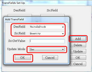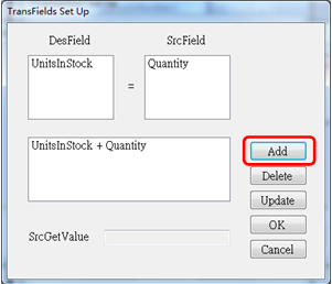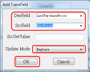 Step6> 再新增一個過帳欄位,按下【Add】按鈕,將『DesField』屬性下拉選擇為【LastPurchasePrice】,『SrcField』屬性則選擇為【UnitPrice】,『UpdateMode』屬性則為【Replace】。按下【OK】。
