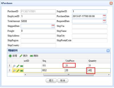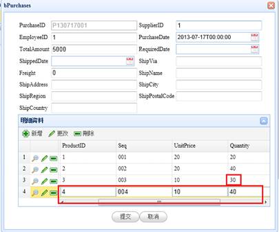 我們試著在某一筆Master所對應的Detail中,去新增一筆Detail。如輸出「產品號碼」為4,「單價」為10,「數量」為40;並在「產品號碼」為3的那筆進行更改,將「數量」原本為10改成30,最後按下Master的「存檔」。