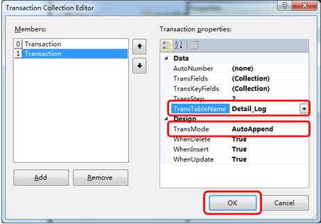 Step2> 打開sPurchases項目,一樣在之前的tsDetail中新增一個Transaction,設定『TransTableName』為【Detail_Log】,『TransMode』為【AlwaysAppend】。