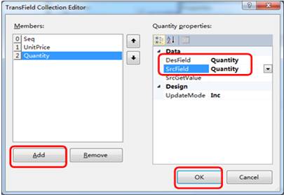 Step5> 接著設定與Products關連的過帳欄位,按下TransFields屬性右邊的小按鈕【…】,出現TransField Collection Editor視窗。按【Add】新增一個TransField,將『DesField』屬性下拉選擇為【UnitsInStock】,『SrcField』屬性則選擇為【Quantity】,『UpdateMode』屬性則為【Inc】。按下【OK】。