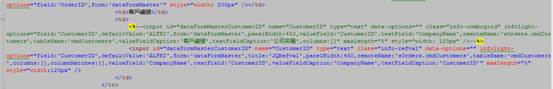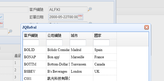請將元件開發使用combogrid的客戶編號註釋起來,重新改寫為使用refval。在改寫中下面這個重點,該元件的class為info-refval。其他的屬性與comboGrid類同。改成代碼請參照如下代碼: