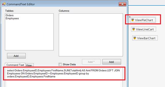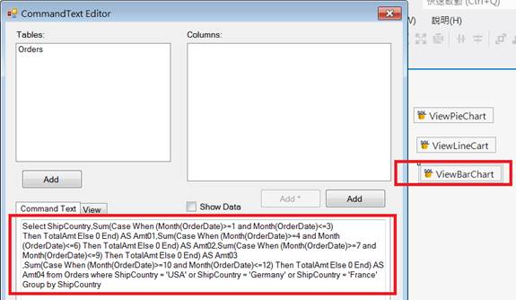 接下來設計BarChart,一樣回到Server端加入一個infocommand,Command Text填入範例語句,測試View可以Showdata後建置Server。