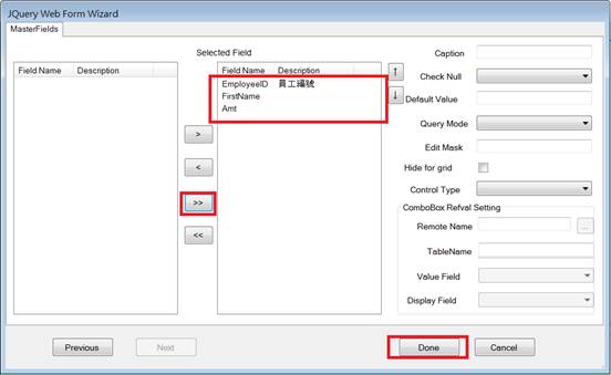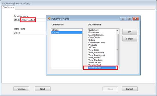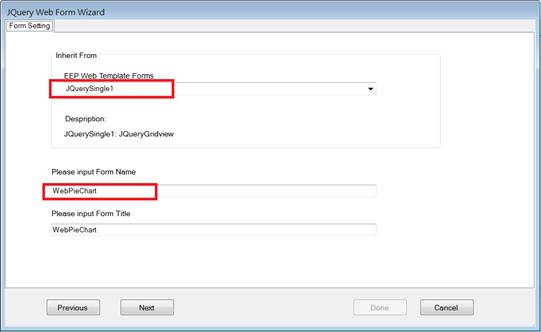 使用Wizard快速建立一個JQuerySingle1的頁面,選擇剛剛新增的ViewPieChart資料來源,並加入所有欄位做為稍後PieChart對照的DataGrid。