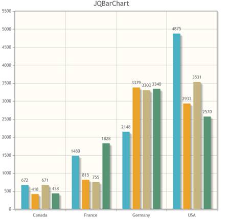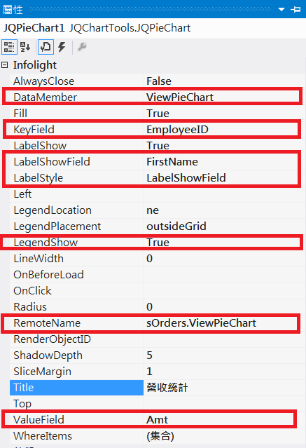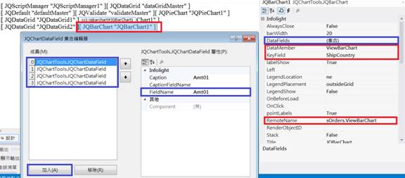接著設定JQBarChart屬性,資料來源RemoteName及DataMember。keyField設定分析的分類項目欄位ShipCountry,相當於X軸刻度的欄位名稱。DataFields為資料群組屬性,相當於設定Y軸的內容,這個屬性中可以設定多個欄位(多組資料)。這裡分別設定Amt01、Amt02、Amt03及Amt04四組資料,做為每季的統計。