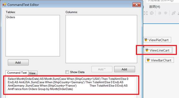 接下來設計LineChart,一樣回到Server端加入一個infocommand,Command Text填入範例語句,測試View可以Showdata後建置Server。