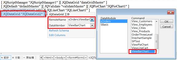 Step11> 可以依照Step2的步驟用Wizard產生一個新的頁面,或是在前面產生的頁面直接加入新的JQDataGrid及JQBarChart元件,JQDataGrid資料來源為ViewBarChart。
