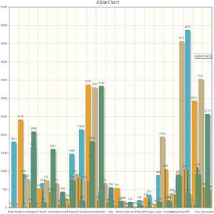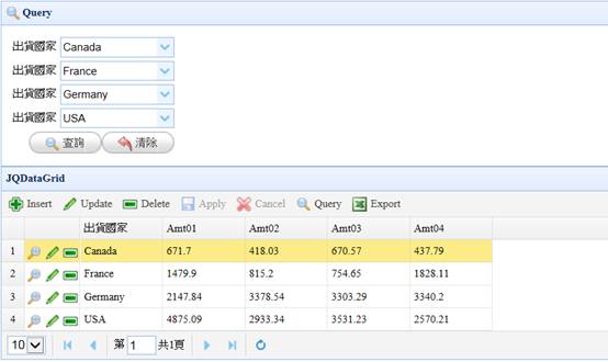 可以看到JQBarChart因資料過多而看起來很雜亂,可透過DataGrid查詢的方式一起動態修改JQBarChart的圖片。在Datagrid的QueryColumn新增數個查詢欄位,統一使用ShipCountry,可自訂資料來源選擇或是讓使用者自行輸入,QueryMode用Panel方便對照。也可另外設定JQDataGrid及JQBarChart的AlwaysClose屬性為true,在設定查詢條件後才顯示資料。