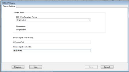 Step4> 接著,設定需要產生報表的模板為SingleLabel,同時將網頁的名字取名為bProductRpt。Form Title設定為產品標籤,這裡的作用是為能夠在報表的標題上顯示對應的設定。