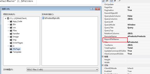 Step8> 最後,在JDataGrid上找到ReportFileName屬性,點開右側的按鈕,在選擇Url的對話框中,找到前面產生的rdlc報表文件。這樣設定完成後,保存畫面。報表的設定就完成了。