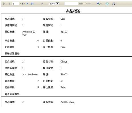 Step9> 這樣,重新登入login打開後,run起bProducts1這個畫面,點擊報表按鈕,直接報表會在打開新窗口中顯示出來。