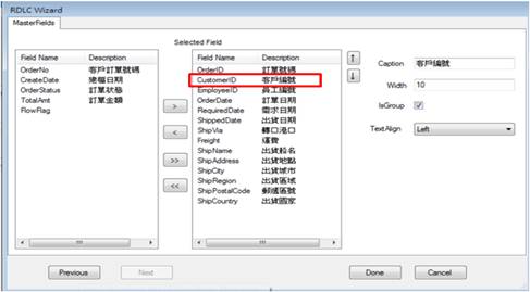 Step6> 最後,選擇報表顯示的欄位,同時最重要的要將CustomerID的IsGroup勾選起來。表示將訂單以CustomerID做Group作爲分組。