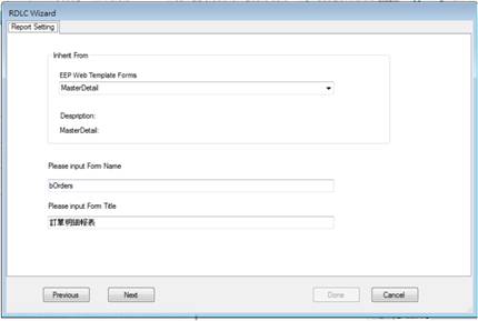 Step1> 按照前面兩個章節那樣,選擇Wizard並使用create RDLC,然後在模板部分選擇MasterDetail,同時網頁命名為bOrders,Title設定為訂單明細報表。
