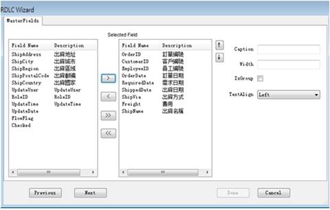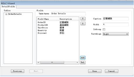 Step4> 接著選中OrderDetails後,選擇中間的Add按鈕,添加Detail的欄位。這樣完成後,點擊Done就可以產生出Master-Detail的報表了。