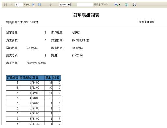 Step6> 最後,在重新打開訂單的畫面,點擊報表按鈕,輸出訂單及訂單明細資料內容的報表。