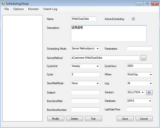 Scheduling主要用於對某些需要規律的週期性執行的動作(目前支持Server Method和執行exe)進行控制。
