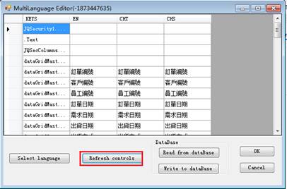 controls按鈕,將畫面中可以設定的標題屬性進行列出。用戶可以對相應的語系進行設置標題,點擊OK完成設定。若您需要保存到資料庫做備份的話只需點擊Write to dataBase即可。