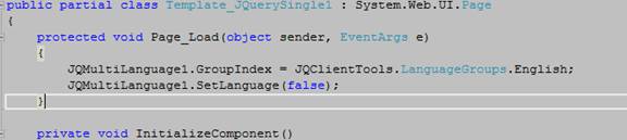 最後,我們通過程式來啓動這個多國語系,程式範例如下。其中當SetLanguage的參數為false時,系統就會根據JQMultiLanguage的GroupIndex屬性來顯示語言了。