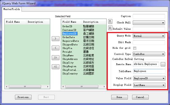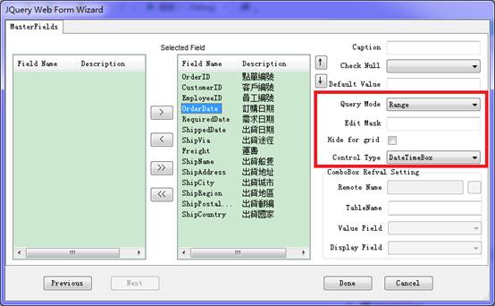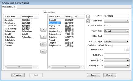 這裡我們通過選中欄位來修改一下右側的Query Mode(查詢模式),以及所使用的元件類型。其中CustomerID為RefVal元件Normal查詢;EmployeeID為Combobox元件Normal查詢;OrderDate為日期欄位Range查詢。而在使用refval和combobox時候,需要對應在ComboBox RefVal
