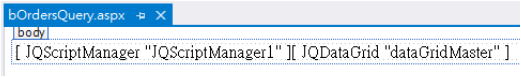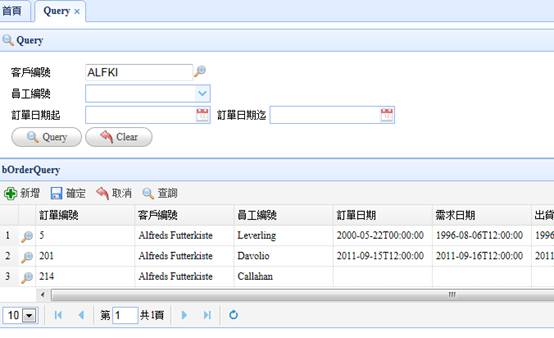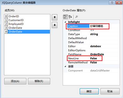 在使用JQuery的查詢時,我們直接設定JQDataGrid的QueryColumns就可以設定查詢的欄位。這裡我們點開這個查詢欄位的編輯器,將訂單日期範圍查詢的caption分別修改為“訂單日期起”以及“訂單日期迄”,同時將“訂單日期迄”的NewLine屬性設定為false。請注意:這部分的修改由於Wizard剛剛產生的新畫面,屬性設定會被vs鎖住,因此請重新開啓網頁後再做設計。