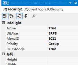設定JQSecurity的屬性,這裡DBAlias設定為登入的這個DB,這裡以ERPS為例,同時將MenuID設定為bOrders1在EEPManager中設定選單項的ID。