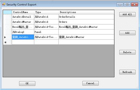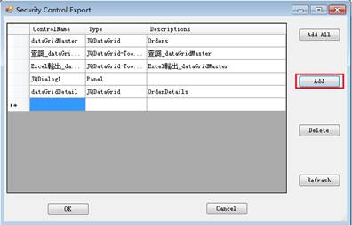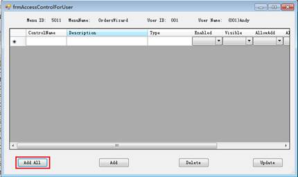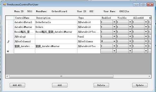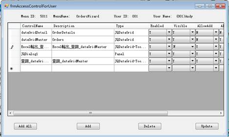 點擊窗口中的Add All,將前面導入的所有控制項添加進來,我們設定dataGridDetail的AllowAdd/AllowUpdate/AllowDelete為N表示Detail不可編輯。同時將dataGridMaster的AllowAdd設定為N,表示不能新增。Excel輸出的按鈕將它的Visible為N。完成後點擊Update。