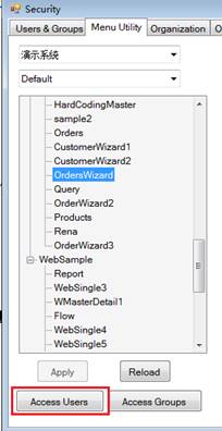 ,打開System -> SecurityManager -> MenuUtility。選中bOrders1這個Menu後,點擊下方的AccessUser來設定用戶的操作權限。