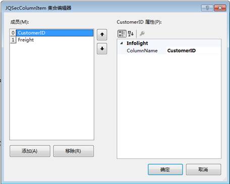 點擊Columns屬性後的按鈕,打開欄位設定的對話框,設置CustomerID以及Freight欄位。