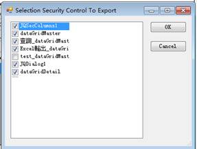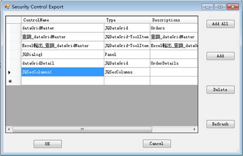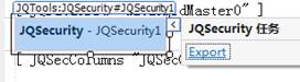 選中JQSecurity這個元件,右上角會出現一個Export的選項。將畫面中的元件做輸出,這部分內容的輸出用於在EEPManager上可以控制每個用戶或者群組對畫面上的按鈕包括資料內容的新增、修改以及可操作性的控制。在Security Control