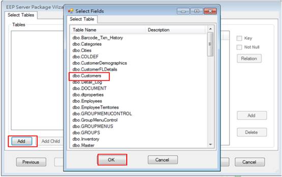 選擇使用的Tables資料表。[Add]-> Select Table [dbo.Customers] -> [OK]