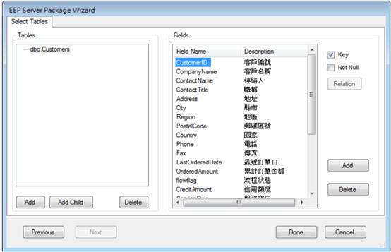 系統會自動帶入Table中的所有欄位與原設定鍵值(Key),請選擇CustomerID檢查鍵值設定,然後點選[Done] 按鈕完成。