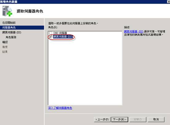 Step8>  選取伺服器角色的選擇畫面中選擇網頁伺服器(IIS)