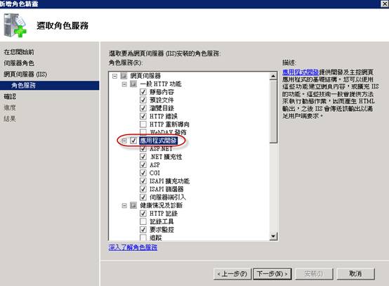 Step10>        在選取角色服務的畫面中,請將應用程式開發的選項勾選到,點擊Next
