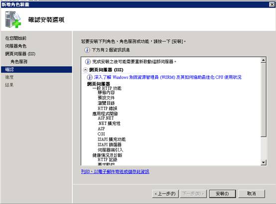 Step9>  在伺服器選定後,畫面會顯示出安裝IIS的確認畫面,這裡直接點選下一步。