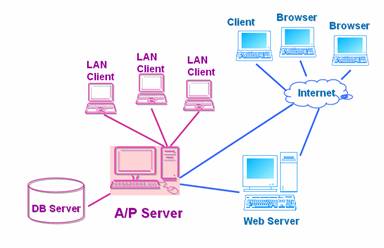 A/P Server,就是 Application Server,用來專門服務企業 Client 端的專屬應用程式伺服主機,簡單而,就是與 Database Server 相似,不同的是 Database 只提供資料庫的專屬服務 ( 如新增/更改/刪除/查詢/預存程式),而 A/P Server 則是提供 Client 端所有的服務,包括資料庫的存取服務,後端邏輯運算,後端服務程式等等,因此它提供了 Database Server 所不能的服務與功能,更不必讓 Client 端安裝資料庫的連線驅動程式,讓 Client 的開發工作可以減少而瘦身( 因為 Client 端會隨著時代變遷而必須重寫 ), 並盡量把商業運算與邏輯往 Server 端開發,來延長系統的使用時限。