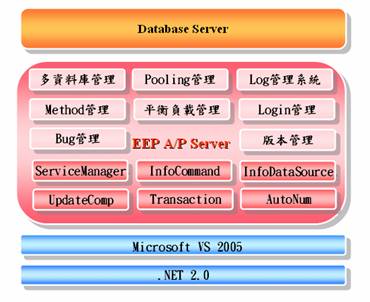 8. 資料庫的動態切換與更換: EEP的 A/P Server 可以獨立設定多組資料庫的連線設定,當 Client 要求 A/P Server 服務時,可以動態指定任一個存在的資料庫連線,更可以用同一個 Server 端的模組來存取不同型態的資料庫 ( 如Oracle/MSSQL/Informix等 ),不用特別改寫。